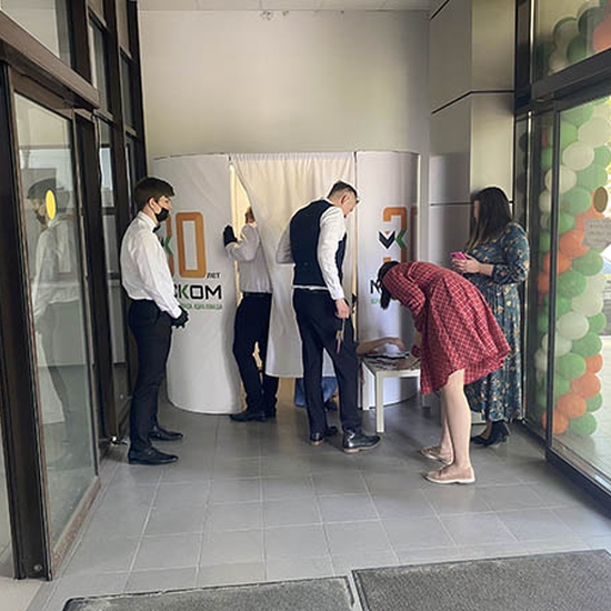 Наша фотобудка на данном юбилее компании - была просто безупречна! Белоснежная фотобудка ярко вписалась с рабочие будние компании! Ищите аттракцион для велком зоны? Или хотите, чтобы ваше промо мероприятие надолго запомнилось гостям? Тогда у нас есть то, что вам нужно - Фотобудка с печатью фотографий с вашим логотипом на них. Как многие возможно видели, в таких аппаратах люди получают сразу четыре кадра сделанных с секундной задержкой, и обычно гости умудряются сделать забавную нарезку из разных поз и выражений. Возможно это не самое распространённое в нашей стране развлечение, но на западе оно уже давно стало классикой. Такие яркие фото будет приятно показать не только друзьям и близким, но и выложить их в соц сетях. Дарите улыбку, как делаем это мы!