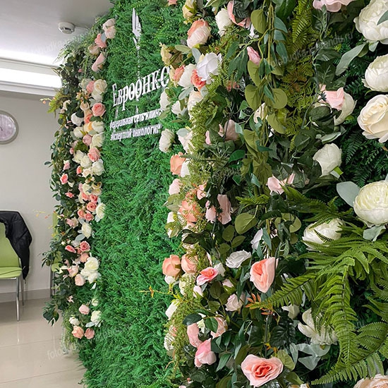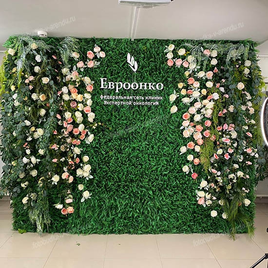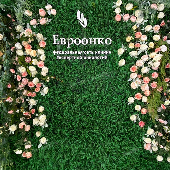 Выбор пал на зеленую фотозону, ведь зеленый цвет - это цвет жизни, цвет живой природы. Именно этого и добиваются специалисты клиники «Евроонко», чтобы все были живы и здоровы. Зеленая стена смотрелась бы слишком скучно, ее было решено украсить искуственными цветами. В центр был добавлен логотип клиники из резных букв.